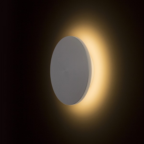 Falra szerelhető kör alakú LED lámpatest, közvetett megvilágításhoz a falról visszavert fénnyel, beltéri és kültéri használatra.