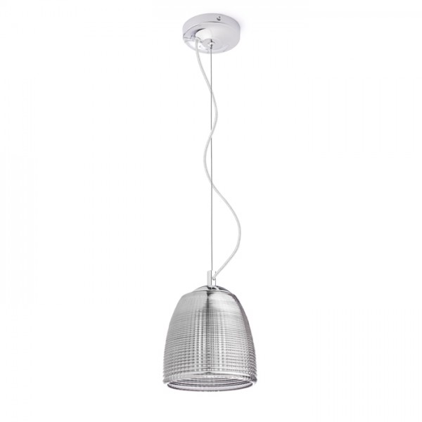Elegáns függő lámpatest strukturált üveggel és króm kiegészítőkkel.