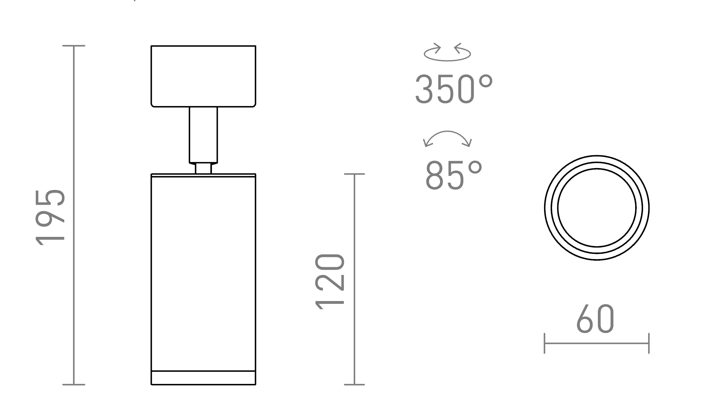 Egyszerű henger alakú reflektor, GU10 foglalattal és kör alappal. A rugóval ellátott talpazat lehetővé teszi különböző hosszúságú izzók használatát.