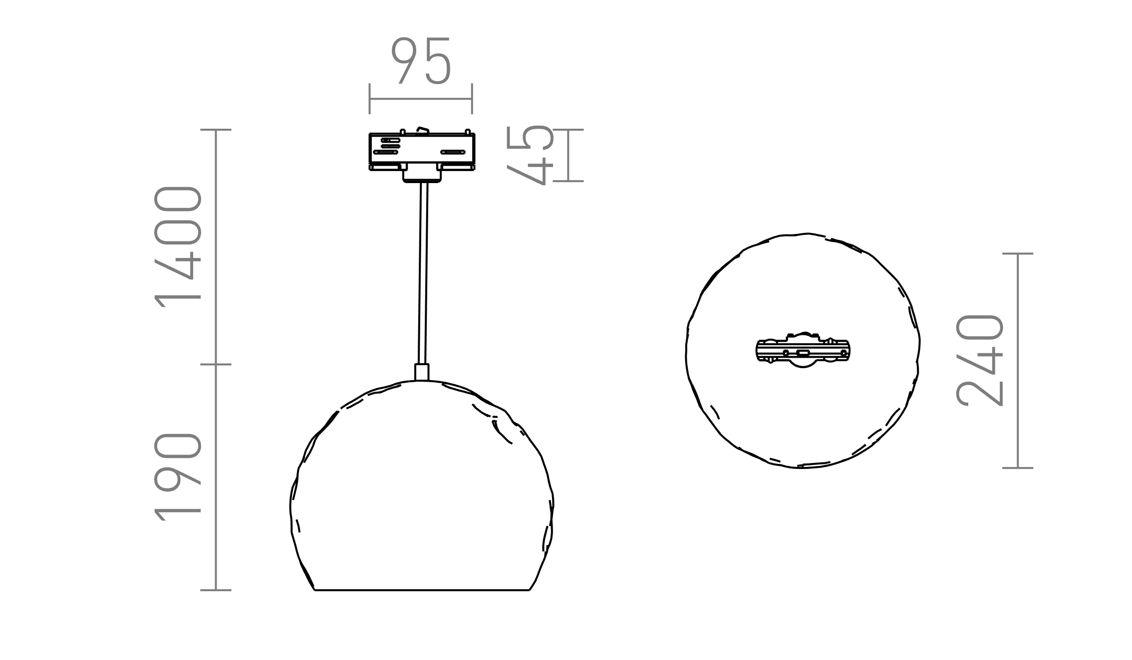 Függő lámpatest horpadt fémbúrával. A lámpabúra külső része réz, belseje lakkozott fehér színű. A fekete PVC kábelt adapter zárja a három áramkörű sínbe.