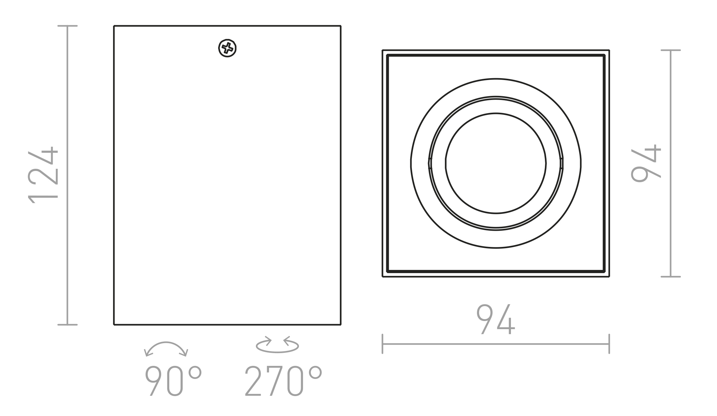 Szögletes, felületre szerelhető mennyezeti lámpatest, forgatható, GU10 foglalatú izzókhoz.