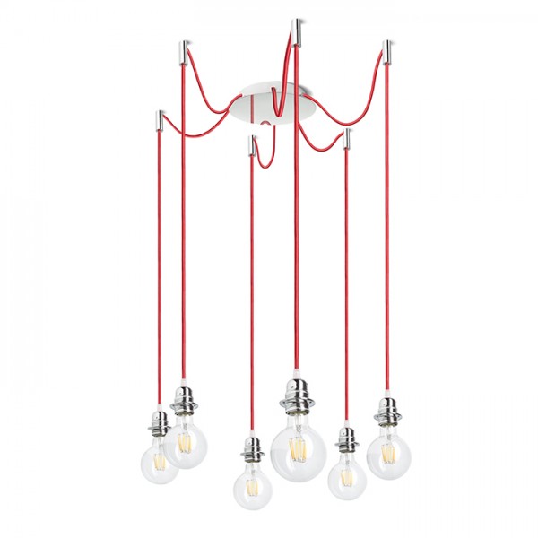 Függesztett lámpatest központi mennyezeti alappal és különálló textil karokkal E27 fém foglalattal, dekoratív izzókkal vagy megfelelő textil lámpabúrákkal történő használatra. A zsanérok króm mennyezeti tartókkal vannak felszerelve, amelyeket az alaptól külön-külön választott távolságra lehet elhelyezni. A kábel teljes hossza 3 m.
