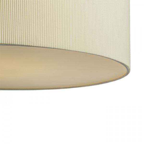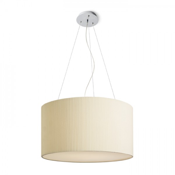 Függő lámpatest krémfehér színű lágyan redőzött búrával három E27 foglalatú fényforráshoz. A fényforrásokat matt akril diffúzor borítja.