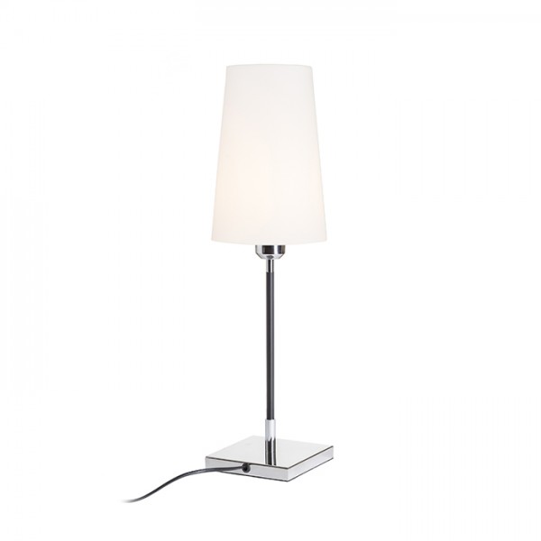 Asztali lámpa textil kúp búrával E27 menetre rögzítve. Króm és elegáns fekete rúd kombinációja.