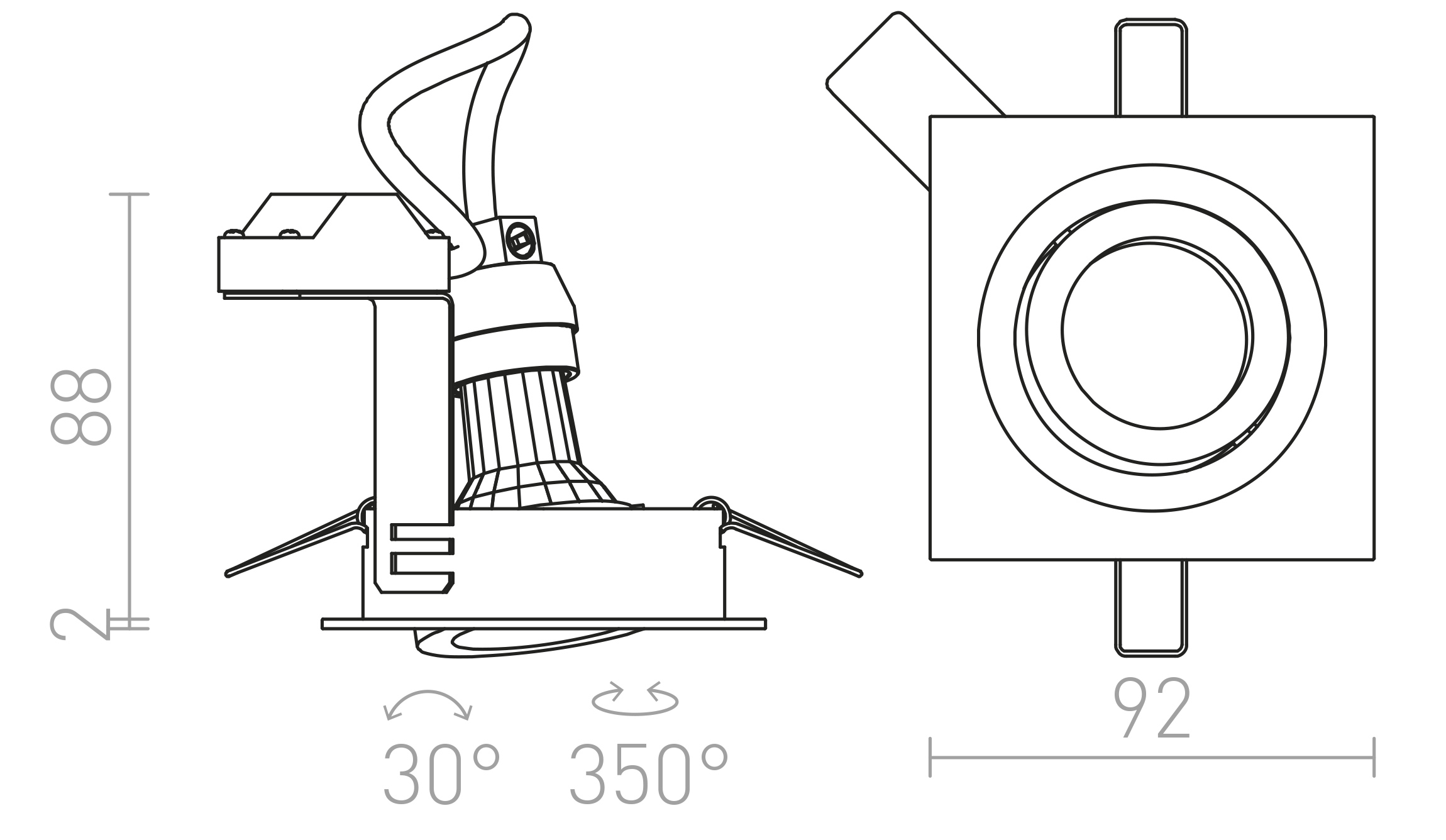 Négyzet alakú süllyesztett lámpatest természetes alumínium kivitelben, két lakkozott változatban.