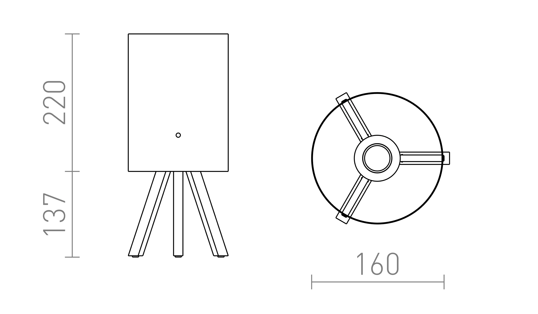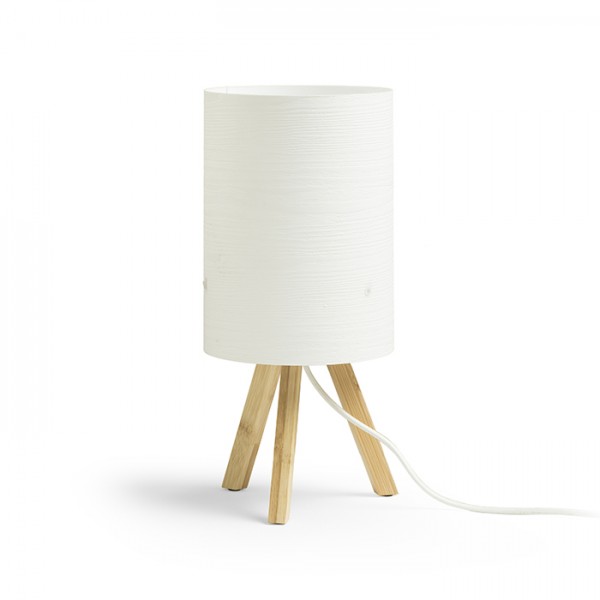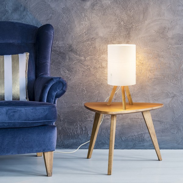 Asztali lámpa fa háromlábú állványon henger alakú búrával.