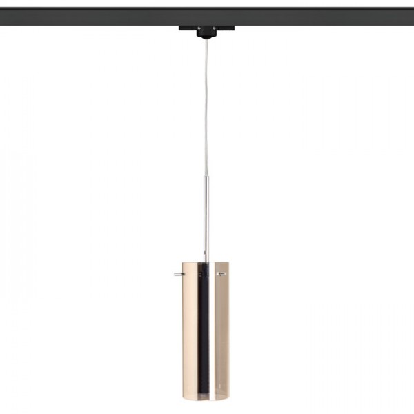 Függő lámpatest üvegbúrával és adapterrel három áramkörű sínhez. A kivilágítatlan lámpatest tükröződik, világítás közben a fényforrások részben láthatók.
