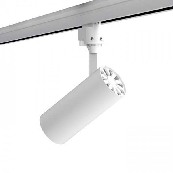 Tiszta kialakítású LED reflektor lámpatest három áramkörű sínrendszerhez, a belső reflektor és a lámpatest felületének különböző színű kivitelével.
